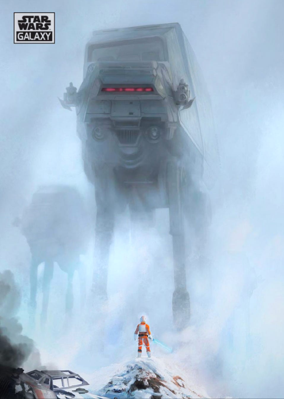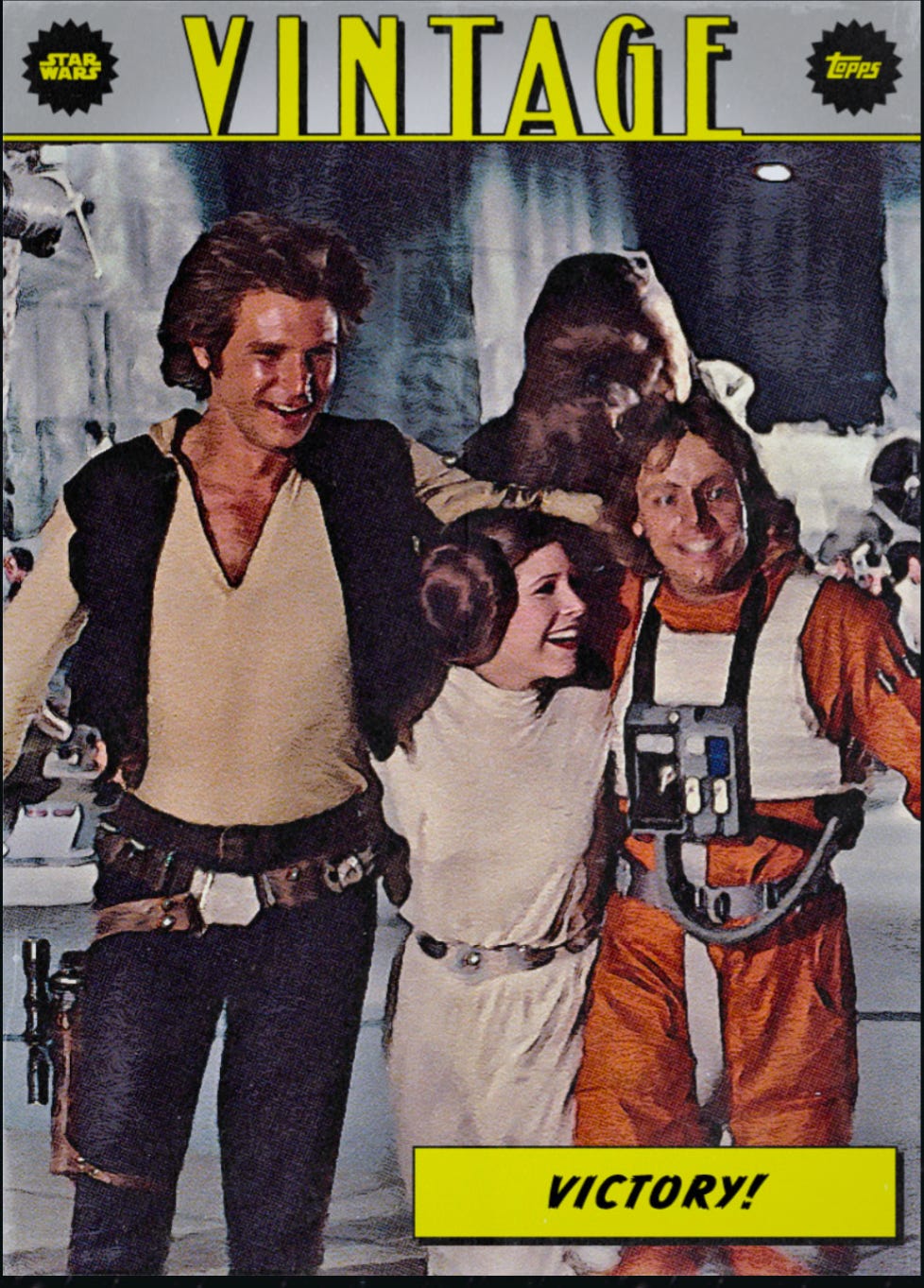 The look of this card is spectacular and takes me right back to the tension and excitement of The Empire Strikes Back. Luke is facing down the goliath AT-AT. I love how this card tells a story with the hazy snowy atmosphere and the second AT-AT looming in the background. This card is gold.